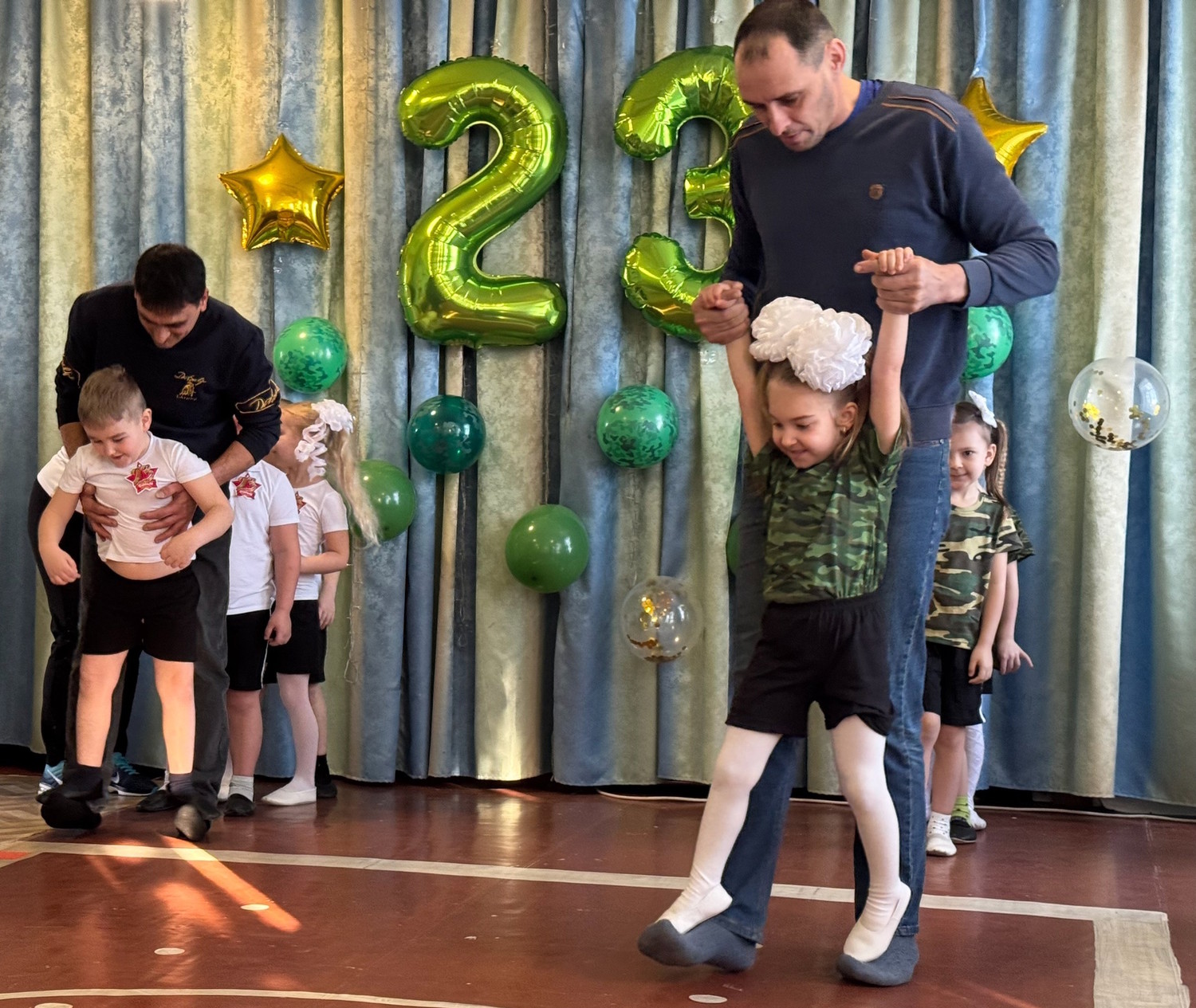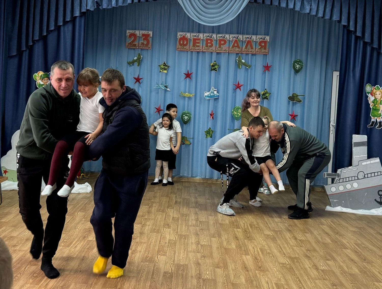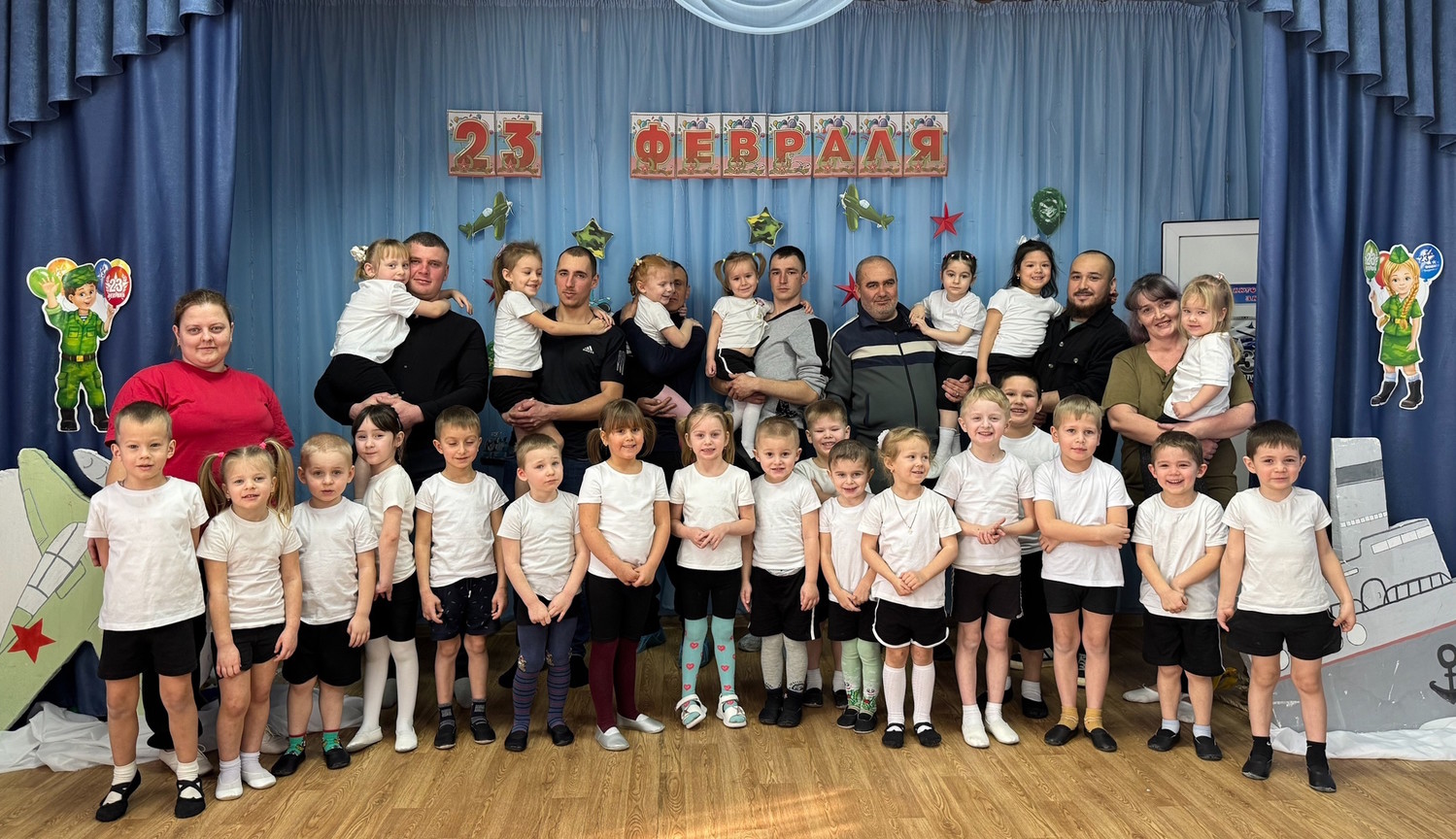 Ребята средних и старших групп пригласили на праздник своих пап. Вместе они окунулись в атмосферу веселья, спорта, мужества и семейного единения. Дошколята вместе с папами с задором участвовали в конкурсах, пели песни и с выражением читали стихи.