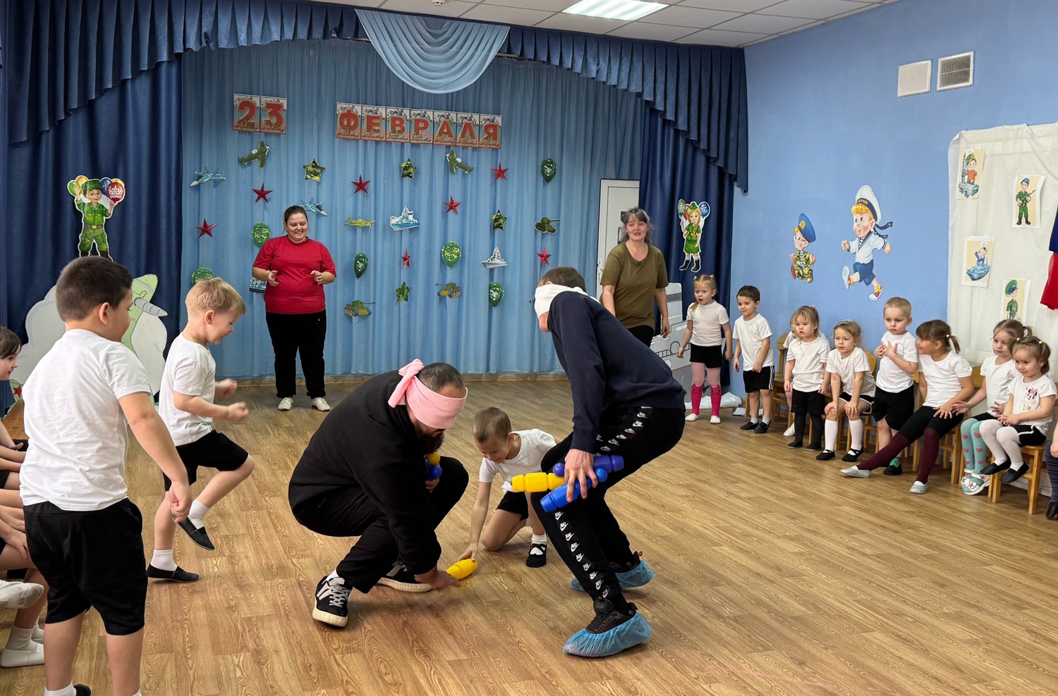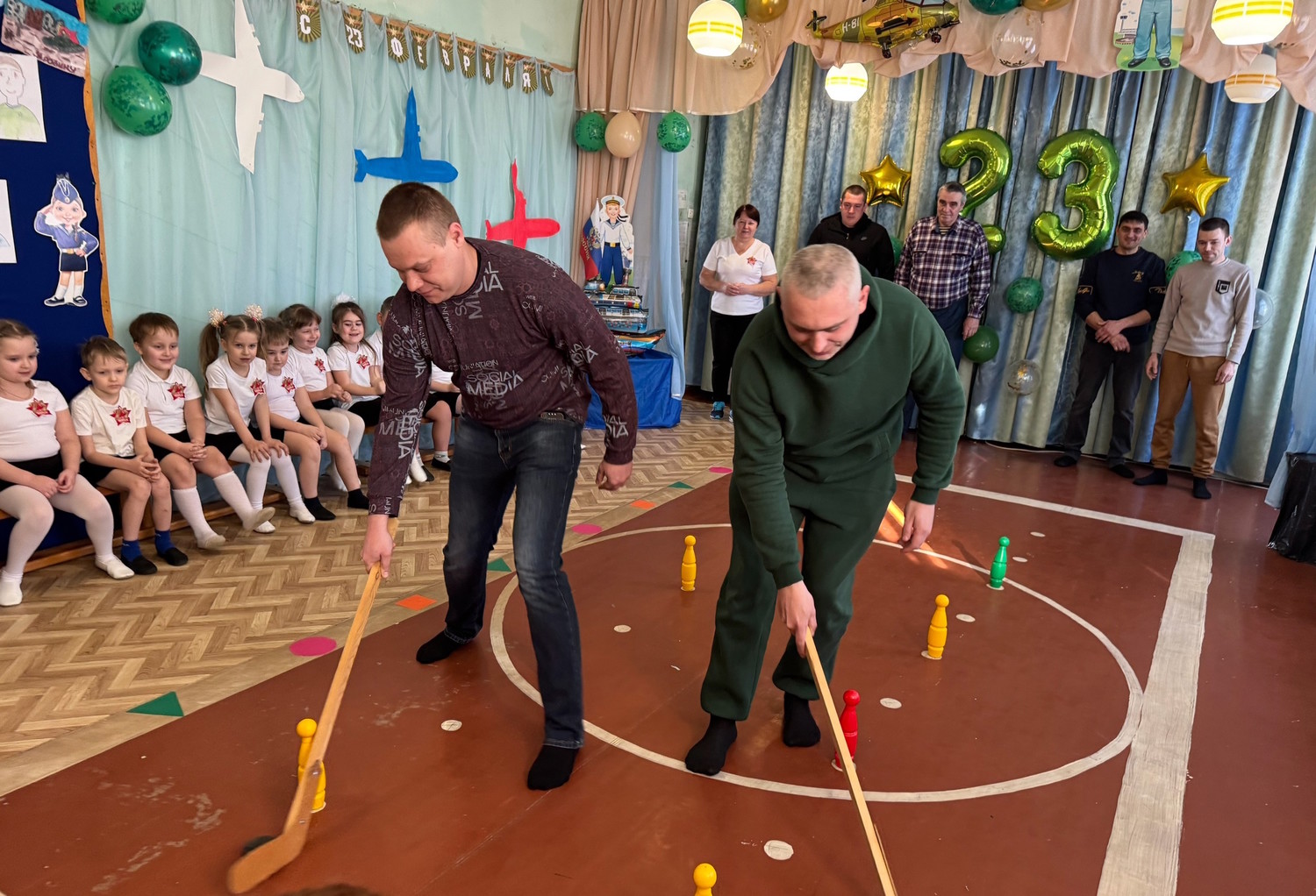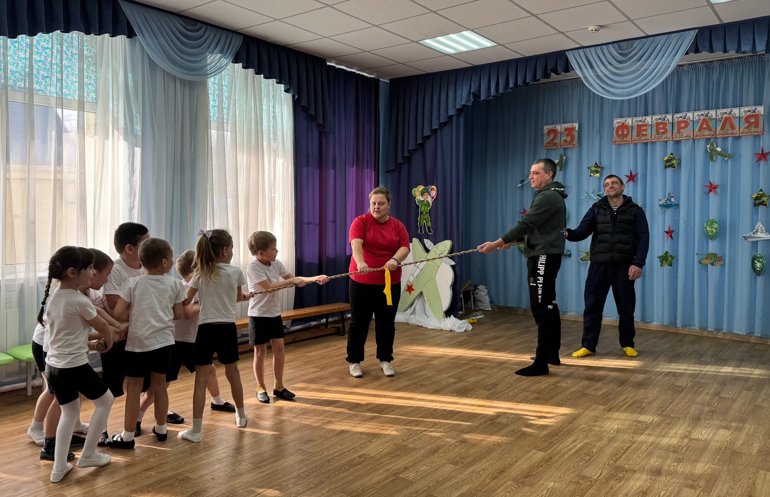 Ребята средних и старших групп пригласили на праздник своих пап. Вместе они окунулись в атмосферу веселья, спорта, мужества и семейного единения. Дошколята вместе с папами с задором участвовали в конкурсах, пели песни и с выражением читали стихи.