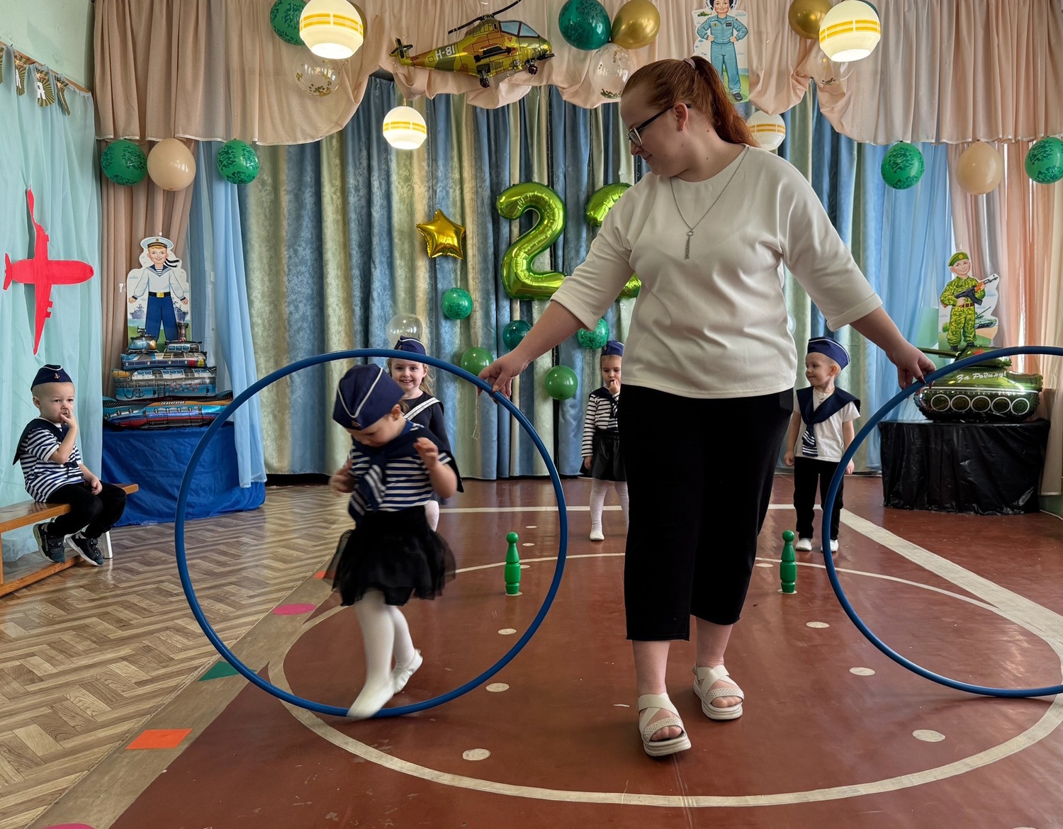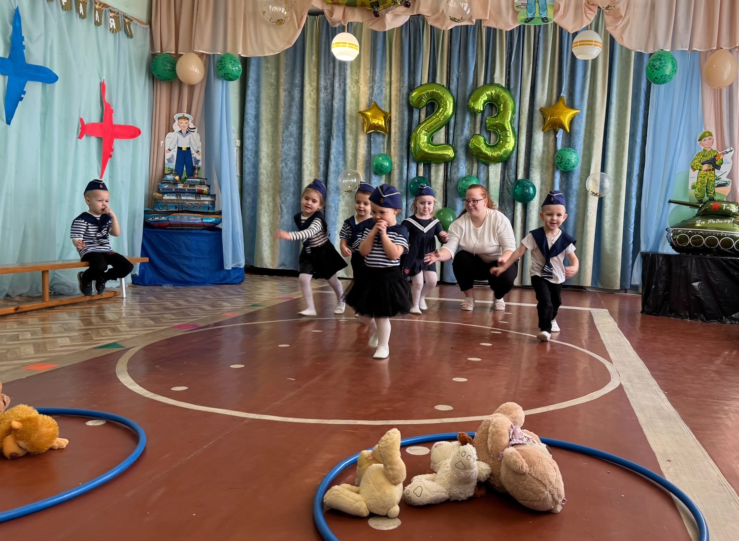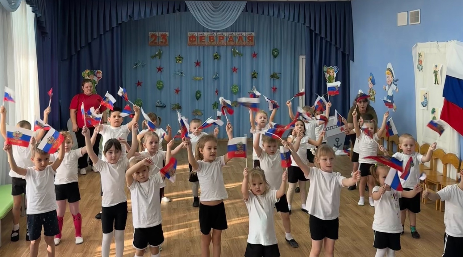 Накануне Дня защитника Отечества во всех возрастных группах прошли праздничные мероприятия, посвященные этому знаменательному дню – дню мужества и чести, доблести и самоотверженности воинов всех поколений. Ребята-дошколята младших групп «Звездочки» и «Непоседы» были морячками. Они задорно танцевали «Яблочко», маршировали с флажками и с большим удовольствием играли в веселые игры. Яркие костюмы морячков добавили атмосферы праздника и веселья!