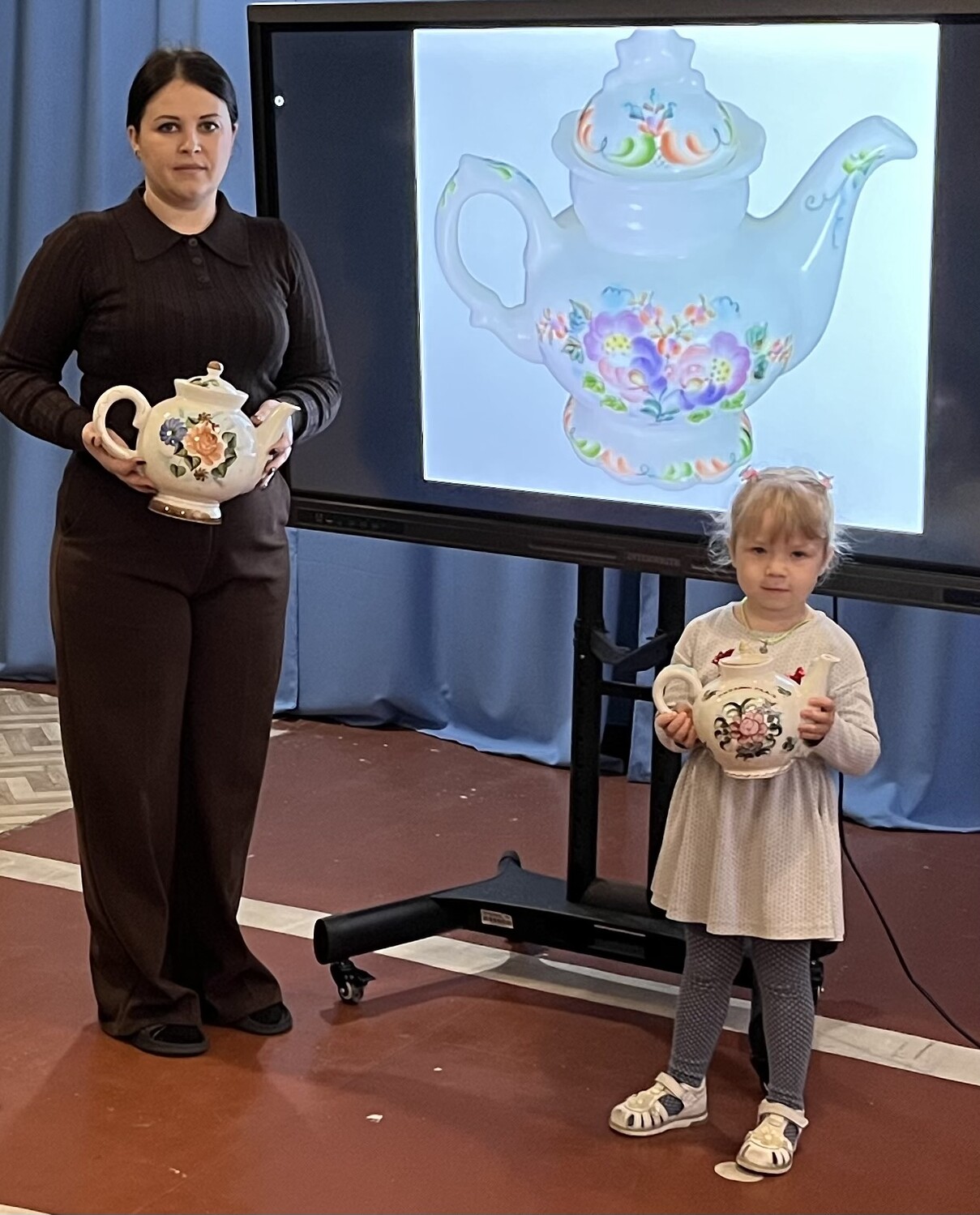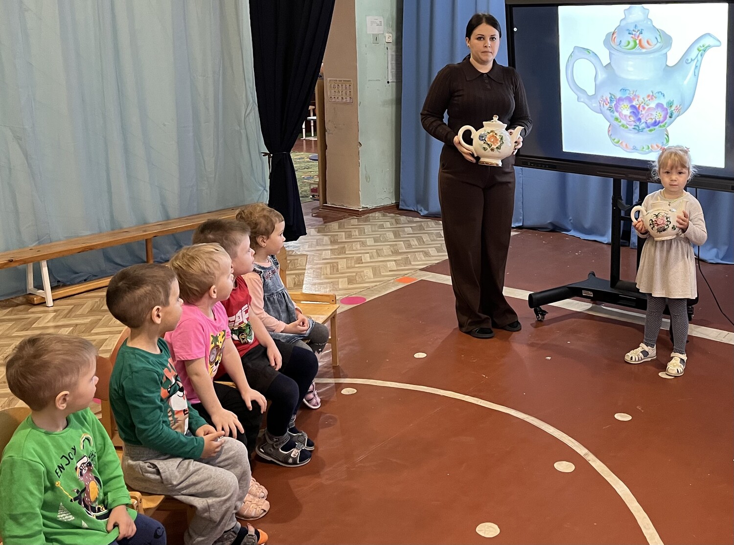 В младшей группе «Непоседы» прошло увлекательное занятие, посвящённое Семикаракорской керамике — самобытному народному промыслу Донского края. Цель мероприятия — приобщать малышей к культурному наследию региона, развивать эстетическое восприятие и творческие навыки. Мы рассказали детям о Семикаракорской керамике — о том, как мастера создают удивительные изделия из глины, обжигают их и расписывают яркими узорами. Ребята узнали, что каждая деталь росписи имеет свой смысл, а мотивы часто вдохновлены природой Донского края: цветами, ягодами, листьями. Изюминкой занятия стало знакомство с настоящим Семикаракорским чайником. Дети с восторгом изучали его: ощупывали причудливые изгибы формы, разглядывали яркие узоры, пытаясь угадать, какие растения и плоды изображены, делились впечатлениями: «Это клубника!», «А тут цветочек, как у бабушки в саду!». Воспитатель пояснял значение отдельных элементов росписи, подчёркивая, как мастера передают через узоры красоту родной природы.