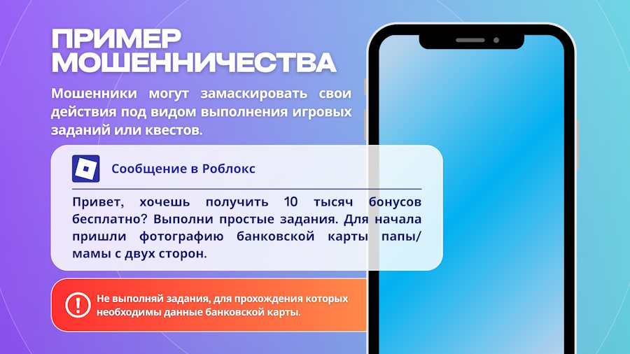 Мошенники, используя виртуальные аккаунты, пишут детям сообщения с предложениями получить бесплатные бонусы или дополнительные ценные предметы на игровой платформе. Для реализации предложений просят несовершеннолетних направить фото банковских карт родителей, фото онлайн банка, прислать код из сообщения.