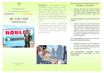 Для противодействия описанным мошенническим действиям прокуратурой Ростовской области, а также минобразованием Ростовской области и Проектом «Навигаторы детства» разработаны серия памяток «Не дай себя обыграть» по порядку действий как не стать жертвой мошенников в Роблокс.